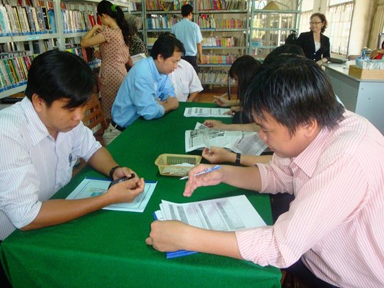 Cán bộ thư viện phỏng vấn bạn đọc